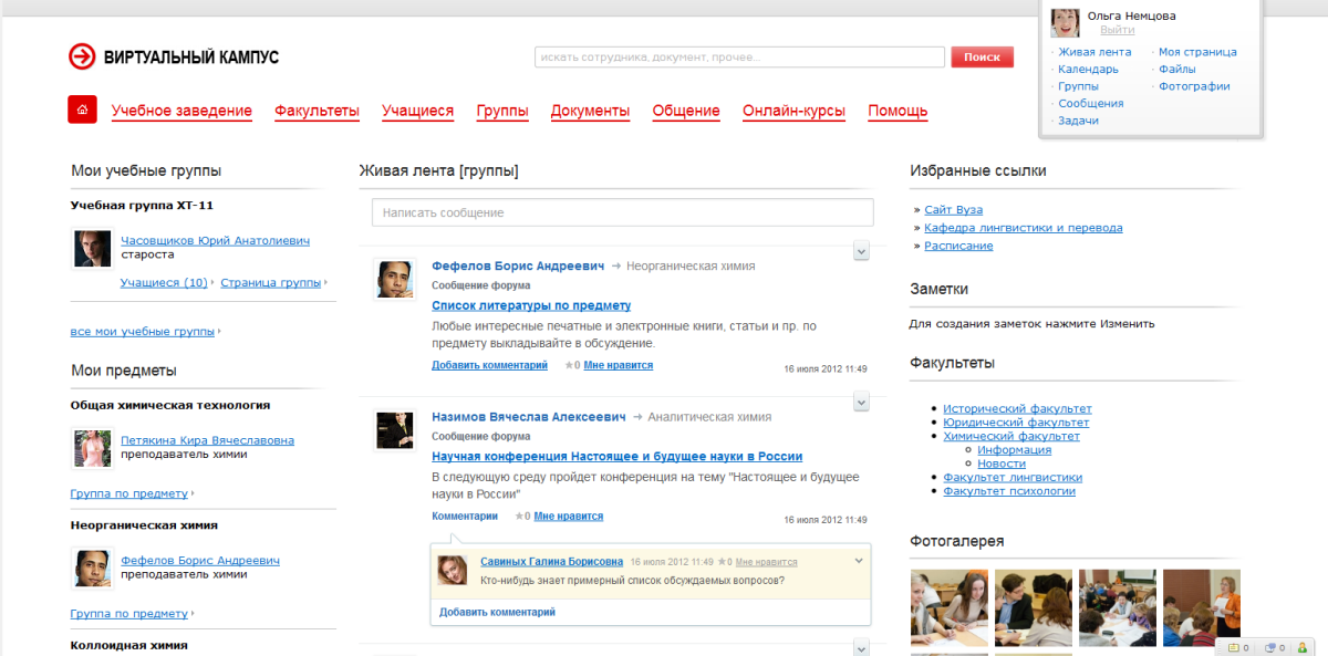 Учебный процесс:- Посмотреть структуру учебного заведения (факультеты/кафедры/администрация), информацию о ключевых персонах;